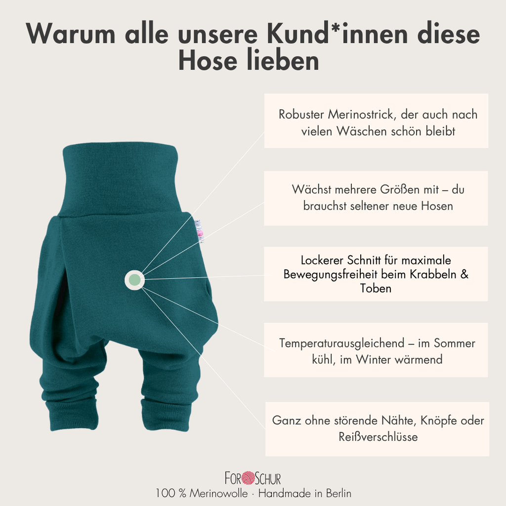 Unsere Every Day Merino Mitwachshose besteht aus 100 % Merinowolle: außen robust, innen weich wie Kaschmir.